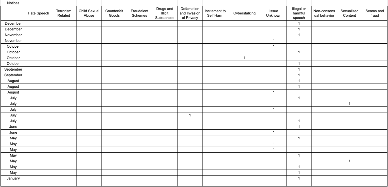 Notices are categorized by the type of alleged illegal content.