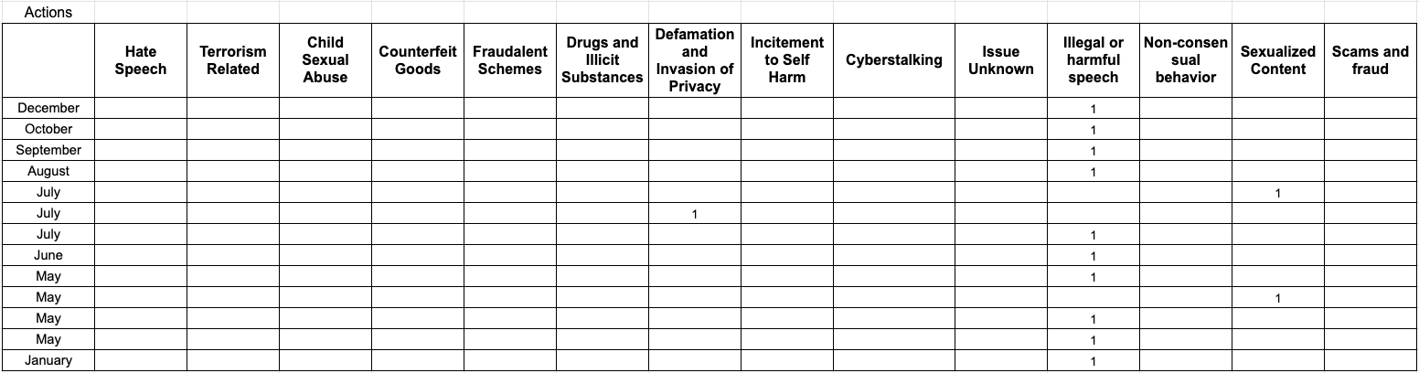 Actions taken on the basis of the terms of use of the service and categorized by the type of alleged illegal content.